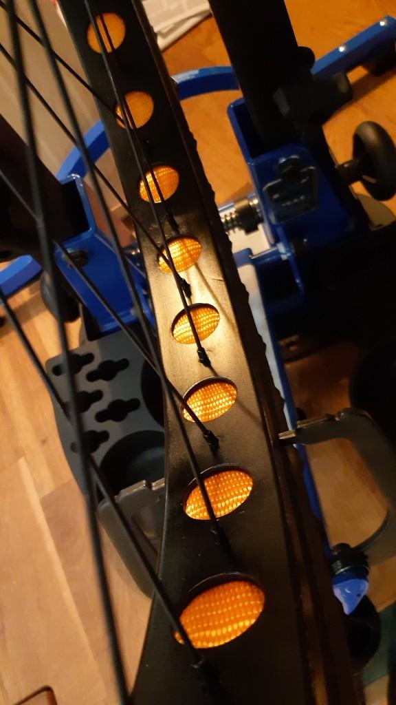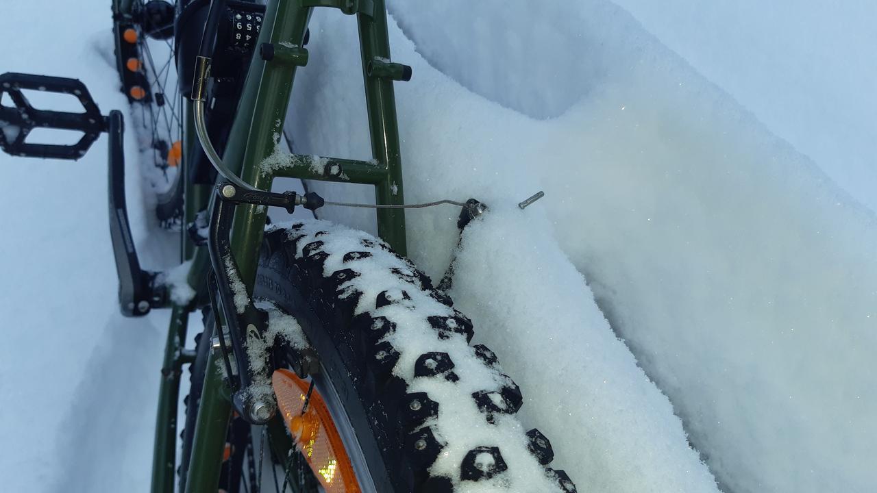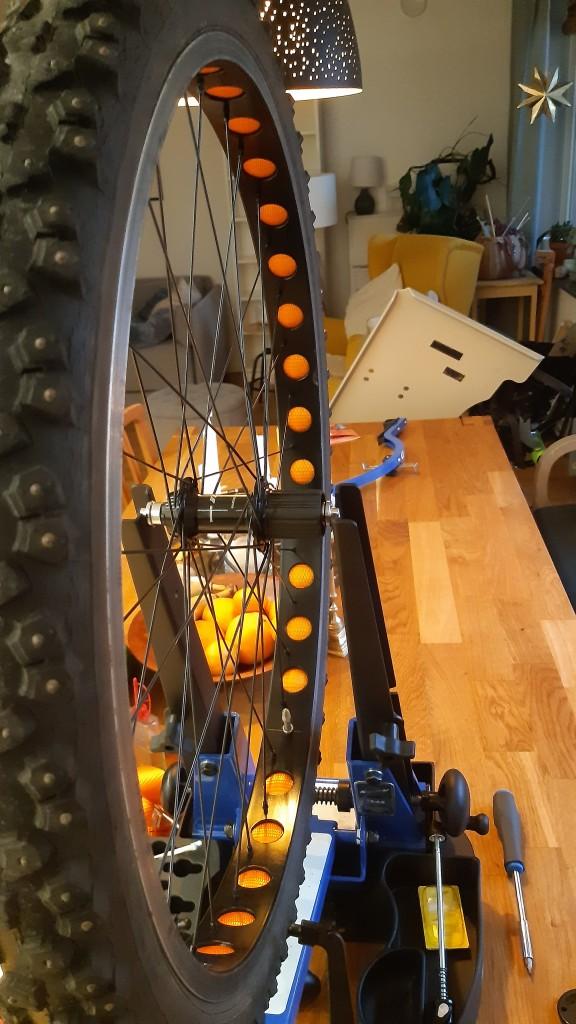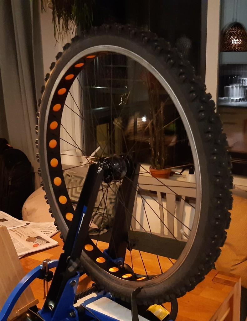 Die Speichen, jeweils 32 Stück, wurden mit drei Kreuzungen eingespeicht. Beide Räder wurden nach dem Einspeichen mit einem alten Paar Nokian Extreme 296 Winterreifen (26x2.1 / 54-559) bezogen.
