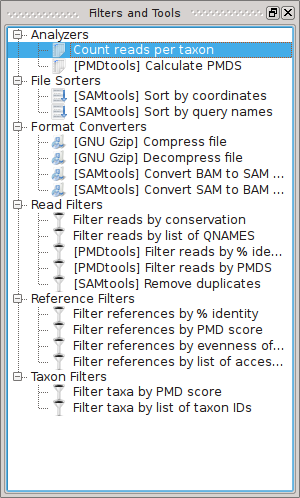 SamSifter includes a variety of filters and tools that can be used to process your input file. You can add one to the workflow by selecting it from either the [Edit] > [Add Filter...] menu or double-clicking an entry in the Filters and Tools dock.