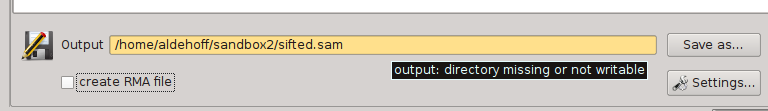SamSifter automatically checks if the file a) exists, b) is readable and c) has the correct file type. The text field containing the file path will be highlighted in orange to show you if any of these conditions are not fulfilled. Hovering the mouse cursor over the text field shows a tooltip with hints how to resolve the error.