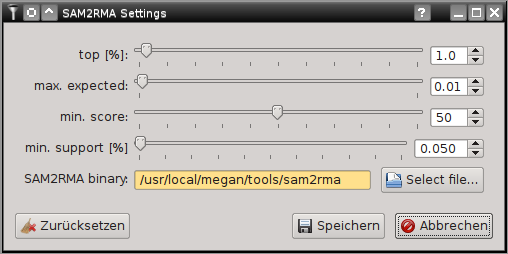 • An output file in SAM or BAM format (again optionally zipped to save space), which similar to the input file can be specified in the lower part of the main window. This part also contains options to enable the generation of RMA files for MEGAN.