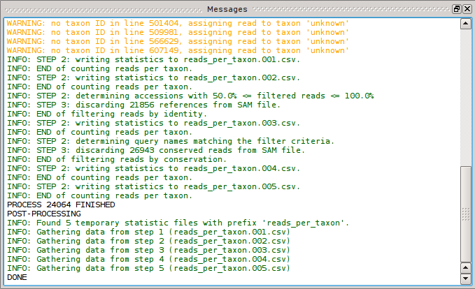 This analysis step will not alter the input file but count the number of reads assigned to each taxon ID. The results are stored to a temporary statistics file as comma-separated values (CSV) with taxon IDs in column taxon_id and the read counts in column read_count.